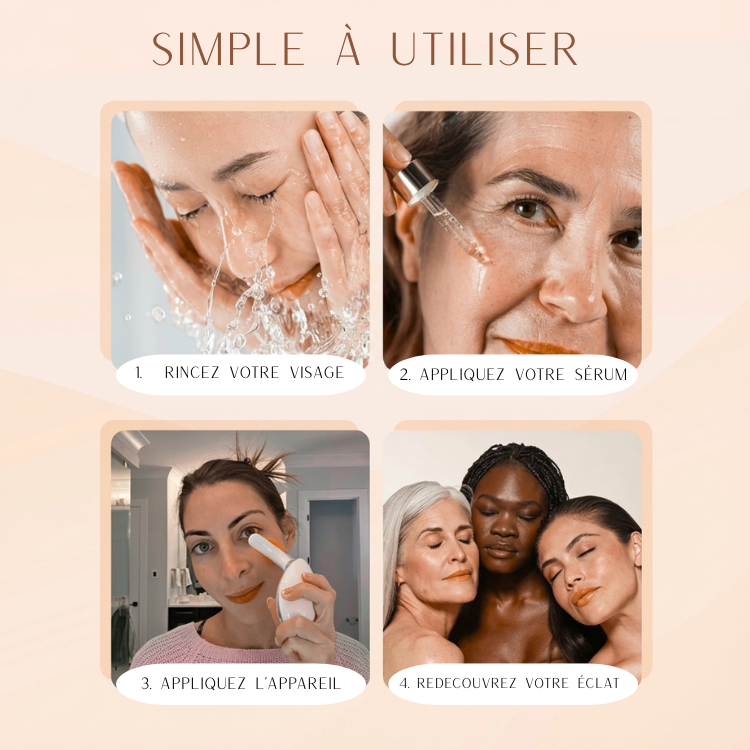 Pas besoin d’être expert(e), notre appareil s'intègre facilement à votre routine beauté. En seulement 5 à 10 minutes par jour, offrez-vous des soins dignes d'un spa, chez vous.